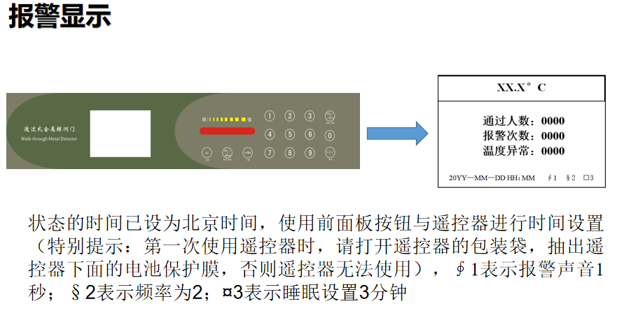 聲光報警,音調快慢可區分金屬物大小,多種報警音量模式適用于不同場合的選擇,通過門柱左右超亮LED報警燈可準確顯示人體相應高度藏匿的違禁物品。測溫報警:提示體溫異常;