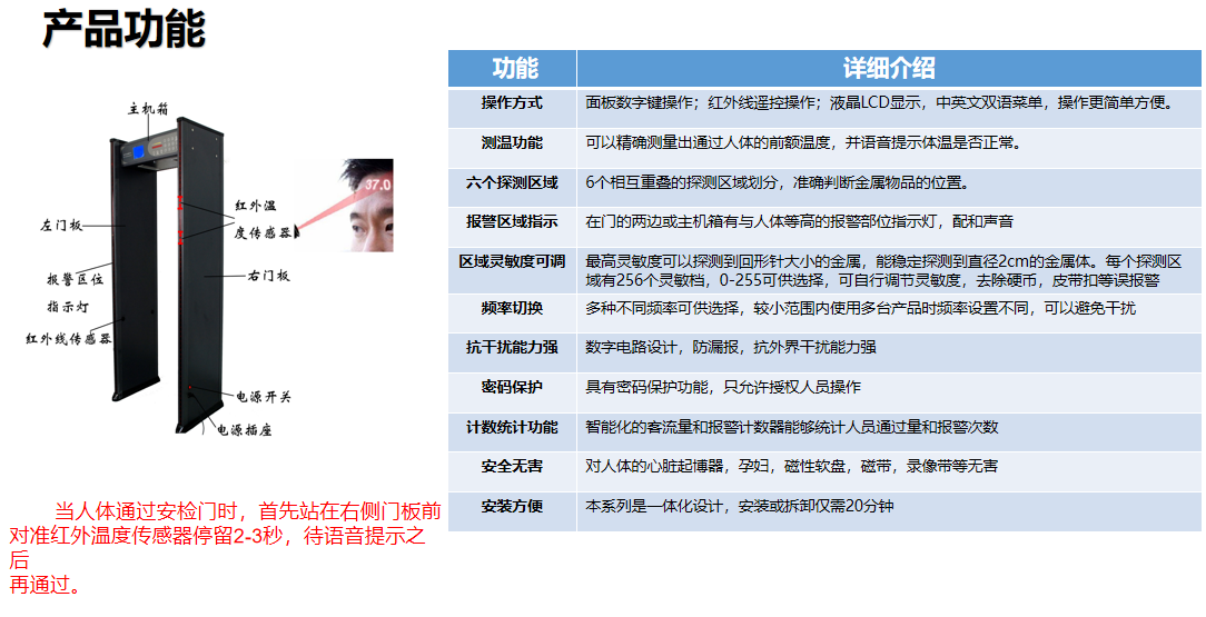 進口雙探頭專業測溫門:有機將紅外測溫采用進口醫學專用紅外雙探頭,上下兩個探頭可以調整,更有利檢測成年人和小朋友,先進行紅外人體測溫,真人發音報警,提示體溫異常,有效防止規模性疾病傳染;